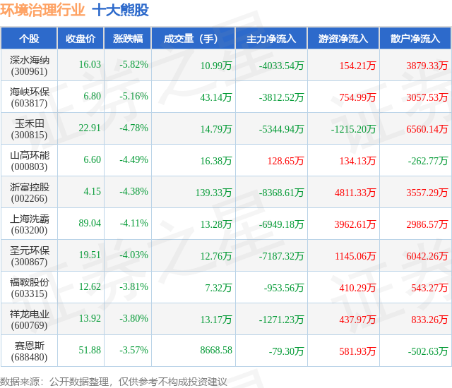 个股表现方面,环境治理行业当日领跌股为深水海纳(300961),该股当日报收16.03,下跌5.82%,成交量10.99万,主力资金净流出4033.54万元。海峡环保(603817)以下跌5.16%紧随其后,该股当日成交量43.14万,主力资金净流出3812.52万元。除此之外,玉禾田(300815)、山高环能(000803)、浙富控股(002266)均进入当日熊股之列。具体个股列表见下表: