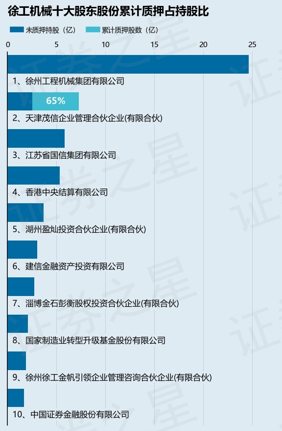 截止本公告日,股东天津茂信企业管理合伙企业(有限合伙)已累计质押股份4.74亿股,占其持股总数的65.0%。本次质押后徐工机械十大股东的累计质押股份占持股比例(占持股比例的计算以公司最新一期财务报表公布的十大股东的持股总数为基准)见下图: