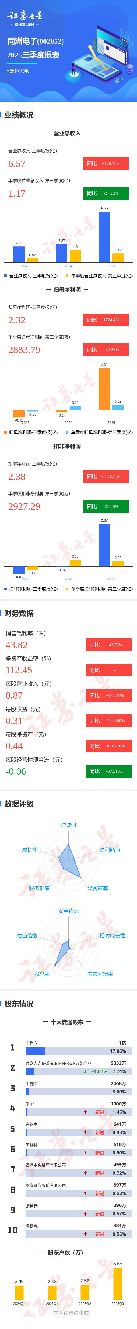 证券之星消息,同洲电子2025年三季报显示,前三季度公司主营收入6.57亿元,同比上升176.75%;归母净利润2.32亿元,同比上升1724.48%;扣非净利润2.38亿元,同比上升5476.87%;其中2025年第三季度,公司单季度主营收入1.17亿元,同比下降27.23%;单季度归母净利润2883.79万元,同比上升32.23%;单季度扣非净利润2927.29万元,同比下降23.49%;负债率55.93%,投资收益132.59万元,财务费用1318.45万元,毛利率43.82%。
