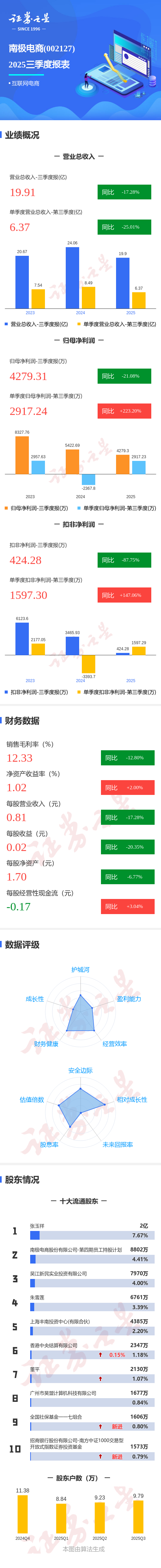 证券之星消息,南极电商2025年三季报显示,前三季度公司主营收入19.91亿元,同比下降17.29%;归母净利润4279.31万元,同比下降21.09%;扣非净利润424.28万元,同比下降87.76%;其中2025年第三季度,公司单季度主营收入6.37亿元,同比下降25.02%;单季度归母净利润2917.24万元,同比上升223.2%;单季度扣非净利润1597.3万元,同比上升147.07%;负债率13.85%,投资收益1695.02万元,财务费用-1419.87万元,毛利率12.33%。