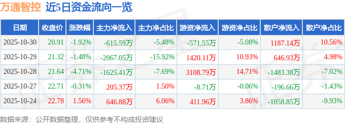 证券之星消息,截至2025年10月30日收盘,万通智控(300643)报收于20.91元,下跌1.92%,换手率2.31%,成交量5.33万手,成交额1.12亿元。