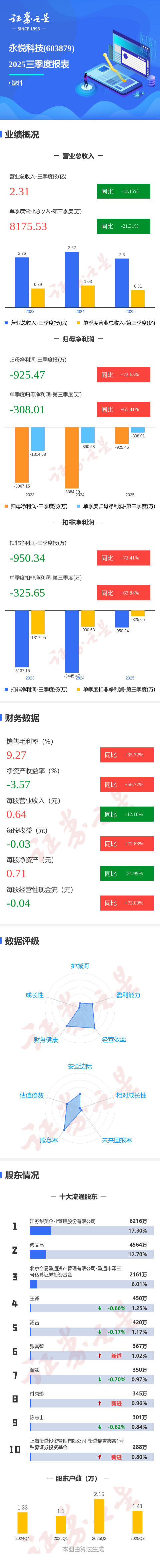 证券之星消息,永悦科技2025年三季报显示,前三季度公司主营收入2.31亿元,同比下降12.15%;归母净利润-925.47万元,同比上升72.65%;扣非净利润-950.34万元,同比上升72.42%;其中2025年第三季度,公司单季度主营收入8175.53万元,同比下降21.31%;单季度归母净利润-308.01万元,同比上升65.41%;单季度扣非净利润-325.65万元,同比上升63.84%;负债率11.85%,财务费用3.82万元,毛利率9.27%。