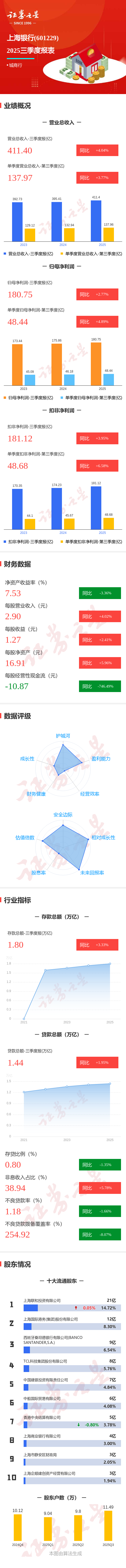 证券之星消息,上海银行2025年三季报显示,前三季度公司主营收入411.4亿元,同比上升4.04%;归母净利润180.75亿元,同比上升2.77%;扣非净利润181.12亿元,同比上升3.95%;其中2025年第三季度,公司单季度主营收入137.97亿元,同比上升3.78%;单季度归母净利润48.44亿元,同比上升4.9%;单季度扣非净利润48.68亿元,同比上升6.58%;负债率92.12%,投资收益167.75亿元。
