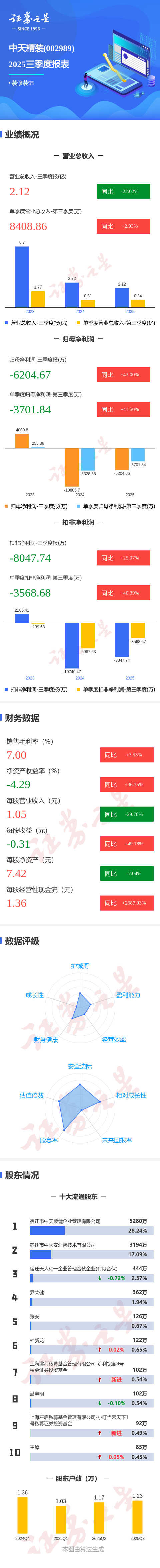 证券之星消息,中天精装2025年三季报显示,前三季度公司主营收入2.12亿元,同比下降22.02%;归母净利润-6204.67万元,同比上升43.0%;扣非净利润-8047.74万元,同比上升25.07%;其中2025年第三季度,公司单季度主营收入8408.86万元,同比上升2.94%;单季度归母净利润-3701.84万元,同比上升41.51%;单季度扣非净利润-3568.68万元,同比上升40.4%;负债率33.35%,投资收益-1076.55万元,财务费用1291.84万元,毛利率7.0%。