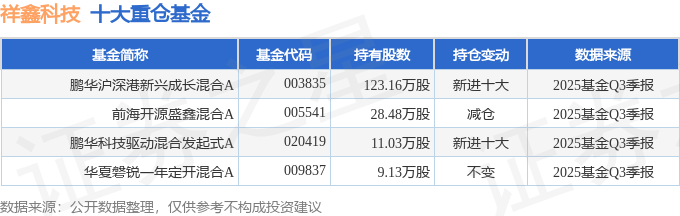持有祥鑫科技最多的基金为鹏华沪深港新兴成长混合A,目前规模为8.53亿元,最新净值1.7658(10月30日),较上一交易日下跌2.47%,近一年上涨55.78%。该基金现任基金经理为闫思倩。