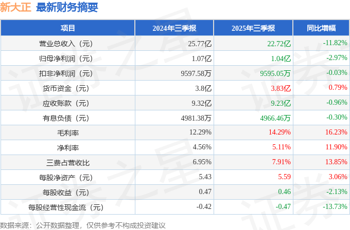 据证券之星公开数据整理,近期新大正(002968)发布2025年三季报。截至本报告期末,公司营业总收入22.72亿元,同比下降11.82%,归母净利润1.04亿元,同比下降2.97%。按单季度数据看,第三季度营业总收入7.69亿元,同比下降9.66%,第三季度归母净利润3267.0万元,同比上升29.38%。本报告期新大正盈利能力上升,毛利率同比增幅16.23%,净利率同比增幅11.9%。
