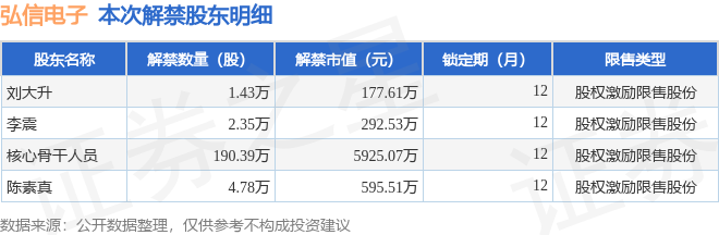 证券之星消息,根据市场公开信息整理,弘信电子(300657)于10月31日将有198.96万股限售股份解禁,为公司股权激励限售股份,占公司总股本0.41%。(本次数据根据历史公告整理得出,实际情况以上市公司最新公告为准)最近一年内,该股累计解禁1203.04万股,占总股本的2.49%。本次解禁后,公司还有1144.63万股限售股份,占总股本2.37%。具体如下图所示: