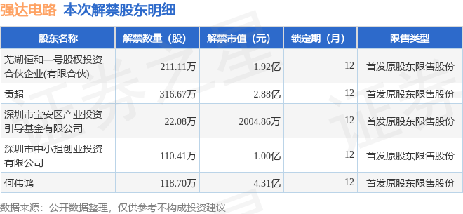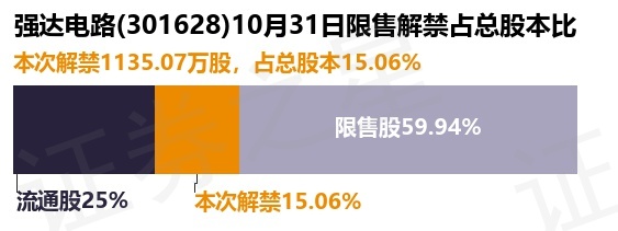 证券之星消息,根据市场公开信息整理,强达电路(301628)于10月31日将有1135.07万股限售股份解禁,为公司首发原股东限售股份,占公司总股本15.06%。(本次数据根据历史公告整理得出,实际情况以上市公司最新公告为准)本次解禁后,公司还有4518.11万股限售股份,占总股本59.94%。具体如下图所示:
