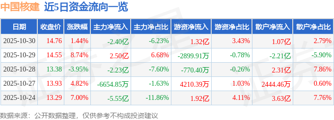 10月30日的资金流向数据方面,主力资金净流出2.4亿元,占总成交额6.23%,游资资金净流入1.32亿元,占总成交额3.43%,散户资金净流入1.07亿元,占总成交额2.79%。