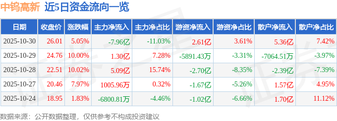 10月30日的资金流向数据方面,主力资金净流出7.96亿元,占总成交额11.03%,游资资金净流入2.61亿元,占总成交额3.61%,散户资金净流入5.36亿元,占总成交额7.42%。