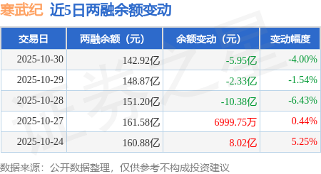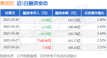 证券之星消息,10月30日,寒武纪(688256)融资买入29.78亿元,融资偿还35.72亿元,融资净卖出5.94亿元,融资余额142.52亿元,近20个交易日中有11个交易日出现融资净买入。