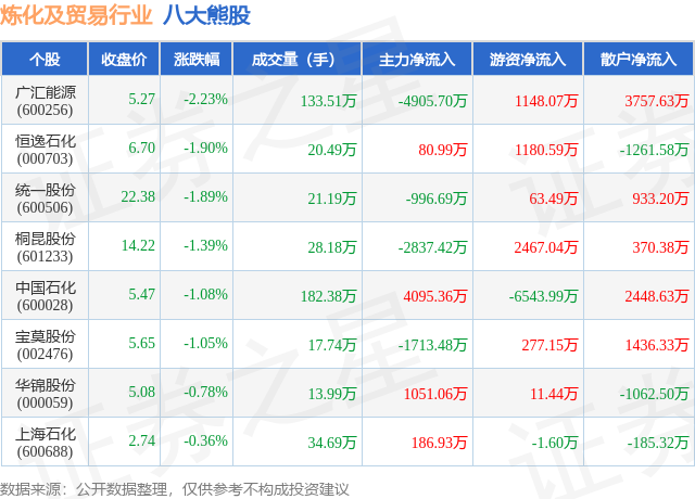 个股表现方面,炼化及贸易行业当日领跌股为广汇能源(600256),该股当日报收5.27,下跌2.23%,成交量133.51万,主力资金净流出4905.7万元。恒逸石化(000703)以下跌1.9%紧随其后,该股当日成交量20.49万,主力资金净流入80.99万元。除此之外,统一股份(600506)、桐昆股份(601233)、中国石化(600028)均进入当日熊股之列。具体个股列表见下表: