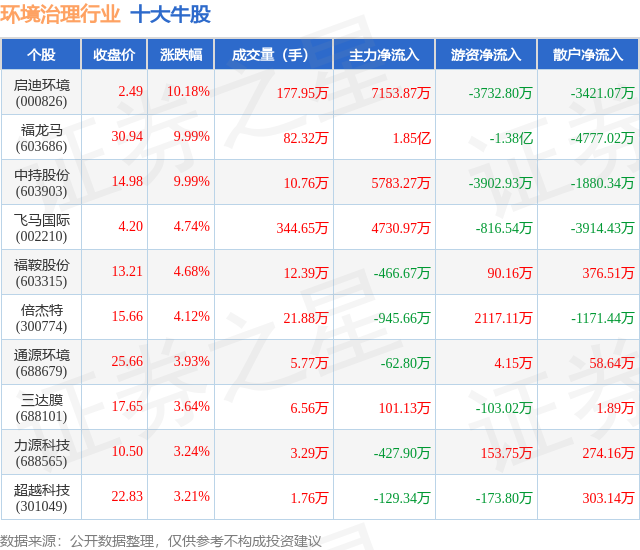 个股表现方面,环境治理行业当日领涨股为启迪环境(000826),该股当日报收2.49,上涨10.18%,成交量177.95万,主力资金净流入7153.87万元。福龙马(603686)以上涨9.99%紧随其后,该股当日成交量82.32万,主力资金净流入1.85亿元。除此之外,中持股份(603903)、飞马国际(002210)、福鞍股份(603315)均进入当日牛股之列。具体个股列表见下表: