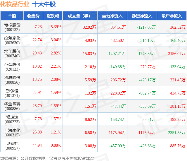 个股表现方面,化妆品行业当日领涨股为青松股份(300132),该股当日报收7.23,上涨5.39%,成交量32.92万,主力资金净流入854.51万元。拉芳家化(603630)以上涨3.04%紧随其后,该股当日成交量4.93万,主力资金净流入482.5万元。除此之外,水羊股份(300740)、芭薇股份(920123)、科思股份(300856)均进入当日牛股之列。具体个股列表见下表: