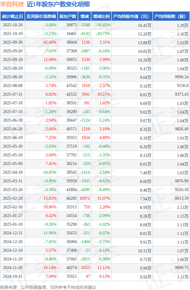 从股价来看,2025年10月10日至2025年10月20日,华自科技区间跌幅为3.04%,在此期间股东户数减少3588.0户,减幅为10.41%。