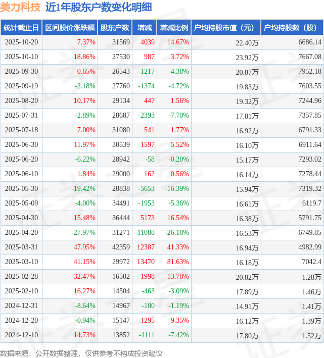 从股价来看,2025年10月10日至2025年10月20日,美力科技区间涨幅为7.37%,在此期间股东户数增加4039.0户,增幅为14.67%。