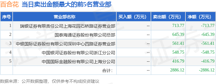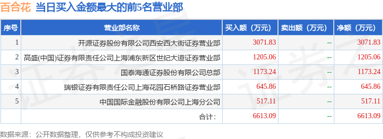 证券之星消息,沪深交易所2025年10月31日公布的交易公开信息显示,百合花(603823)因有价格涨跌幅限制的日收盘价格涨幅偏离值达到7%的前五只证券登上龙虎榜。此次是近5个交易日内第1次上榜。
