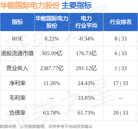 华能国际电力股份港股市值305.99亿港元,在电力行业中排名第6。主要指标见下表: