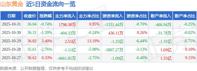 证券之星消息,截至2025年10月31日收盘,山东黄金(600547)报收于36.04元,下跌0.74%,换手率1.45%,成交量52.29万手,成交额19.01亿元。