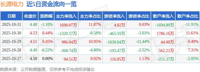 证券之星消息,截至2025年10月31日收盘,长源电力(000966)报收于4.48元,下跌1.1%,换手率0.97%,成交量31.79万手,成交额1.42亿元。