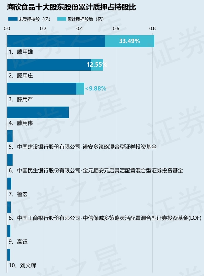 截止本公告日,股东滕用雄已累计质押股份2717.0万股,占其持股总数的33.49%,股东滕用庄已累计质押股份662.91万股,占其持股总数的12.55%,股东滕用严已累计质押股份420.0万股,占其持股总数的9.88%。本次质押后海欣食品十大股东的累计质押股份占持股比例(占持股比例的计算以公司最新一期财务报表公布的十大股东的持股总数为基准)见下图: