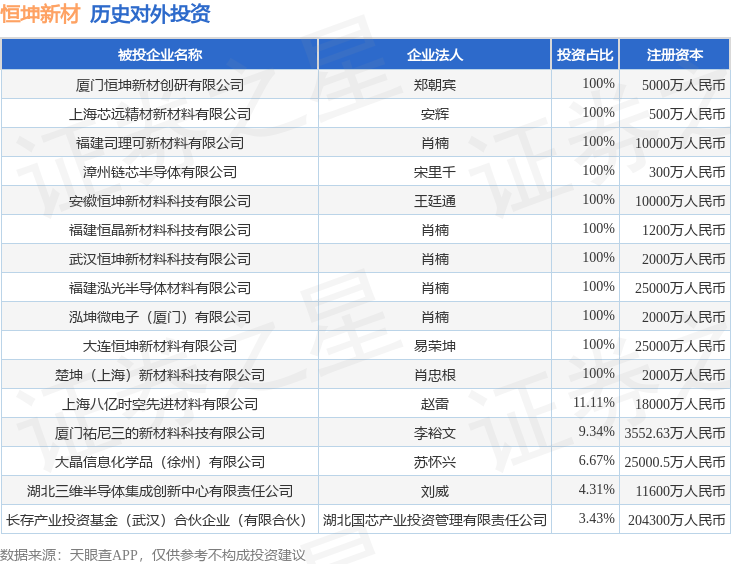 证券之星消息,根据天眼查APP显示,恒坤新材(688727.SH)新增一起对外投资事件,被投资公司为厦门恒坤新材创研有限公司,法定代表人郑朝宾,投资占比为100%。该公司从事计算机、通信和其他电子设备制造业,注册资本为5000万人民币。目前,恒坤新材共存在对外投资16项,详见下表: