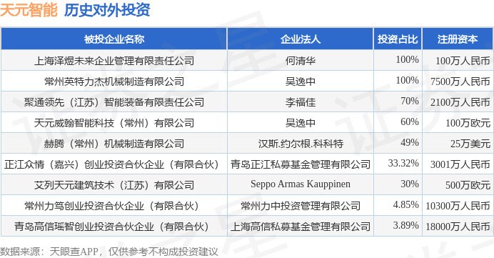 证券之星消息,根据天眼查APP显示,天元智能(603273.SH)新增一起对外投资事件,被投资公司为上海泽煜未来企业管理有限责任公司,法定代表人何清华,投资占比为100%。该公司从事零售业,注册资本为100万人民币。目前,天元智能共存在对外投资9项,详见下表: