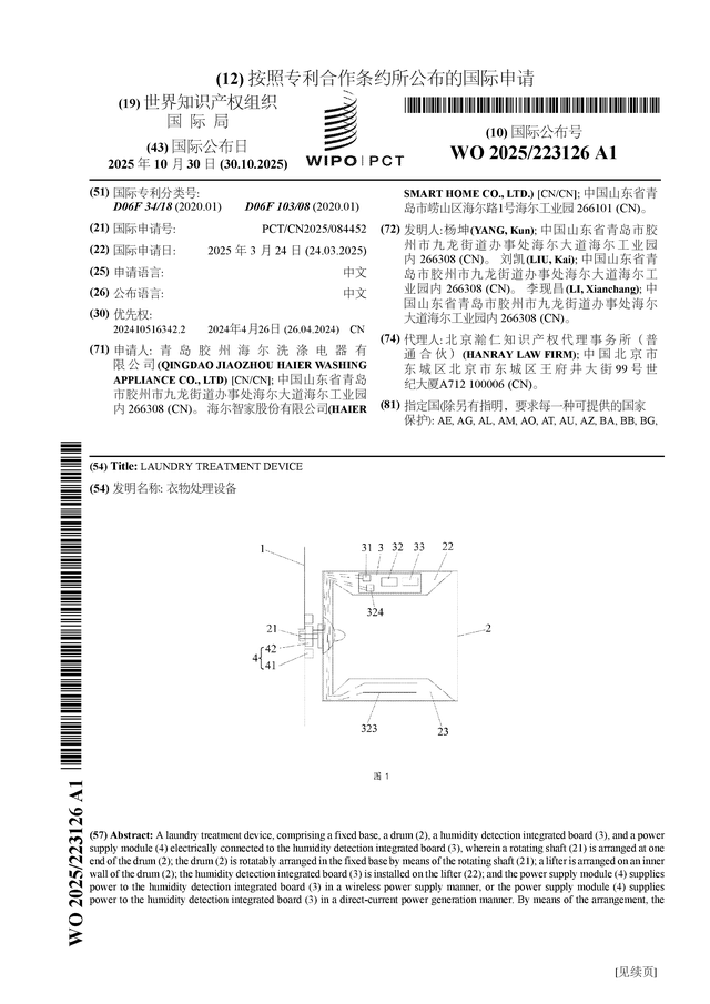 证券之星消息,根据企查查数据显示海尔智家(600690)公布了一项国际专利申请,专利名为“衣物处理设备”,专利申请号为PCT/CN2025/084452,国际公布日为2025年10月30日。