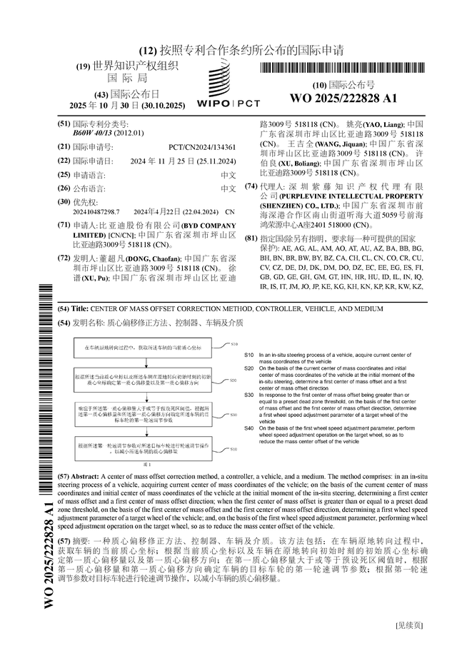 证券之星消息,根据企查查数据显示比亚迪(002594)公布了一项国际专利申请,专利名为“质心偏移修正方法、控制器、车辆及介质”,专利申请号为PCT/CN2024/134361,国际公布日为2025年10月30日。