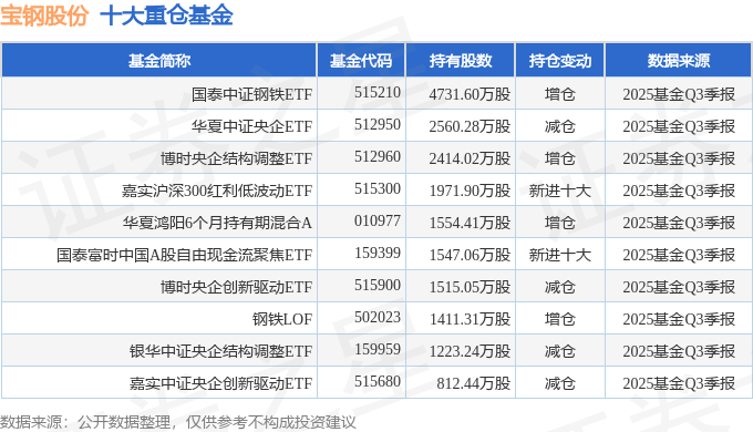 持有宝钢股份最多的基金为国泰中证钢铁ETF,目前规模为36.6亿元,最新净值1.4787(10月31日),较上一交易日下跌0.14%,近一年上涨24.93%。该基金现任基金经理为吴中昊。