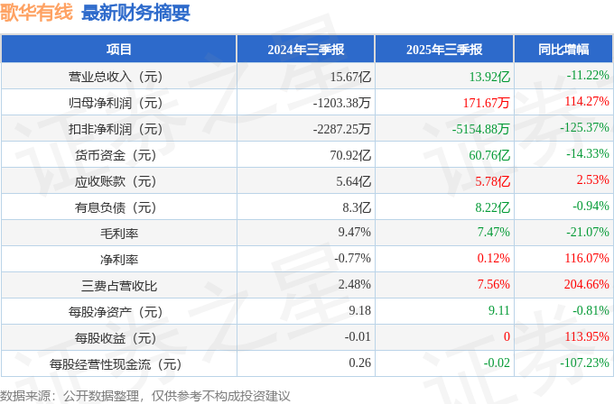 据证券之星公开数据整理,近期歌华有线(600037)发布2025年三季报。根据财报显示,歌华有线净利润同比增长114.27%。截至本报告期末,公司营业总收入13.92亿元,同比下降11.22%,归母净利润171.67万元,同比上升114.27%。按单季度数据看,第三季度营业总收入4.58亿元,同比下降9.8%,第三季度归母净利润1141.1万元,同比下降65.15%。