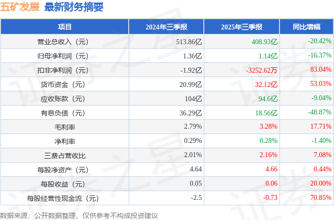据证券之星公开数据整理,近期五矿发展(600058)发布2025年三季报。截至本报告期末,公司营业总收入408.93亿元,同比下降20.42%,归母净利润1.14亿元,同比下降16.37%。按单季度数据看,第三季度营业总收入139.13亿元,同比下降16.75%,第三季度归母净利润626.16万元,同比下降92.68%。本报告期五矿发展公司应收账款体量较大,当期应收账款占最新年报归母净利润比达7528.63%。