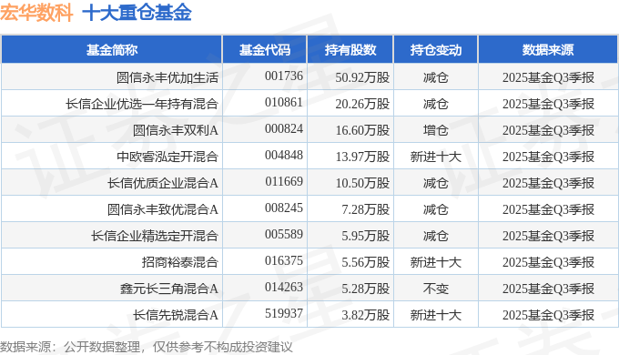 持有宏华数科最多的基金为圆信永丰优加生活,目前规模为12.96亿元,最新净值3.571(10月31日),较上一交易日下跌0.42%,近一年上涨19.51%。该基金现任基金经理为陈臣。