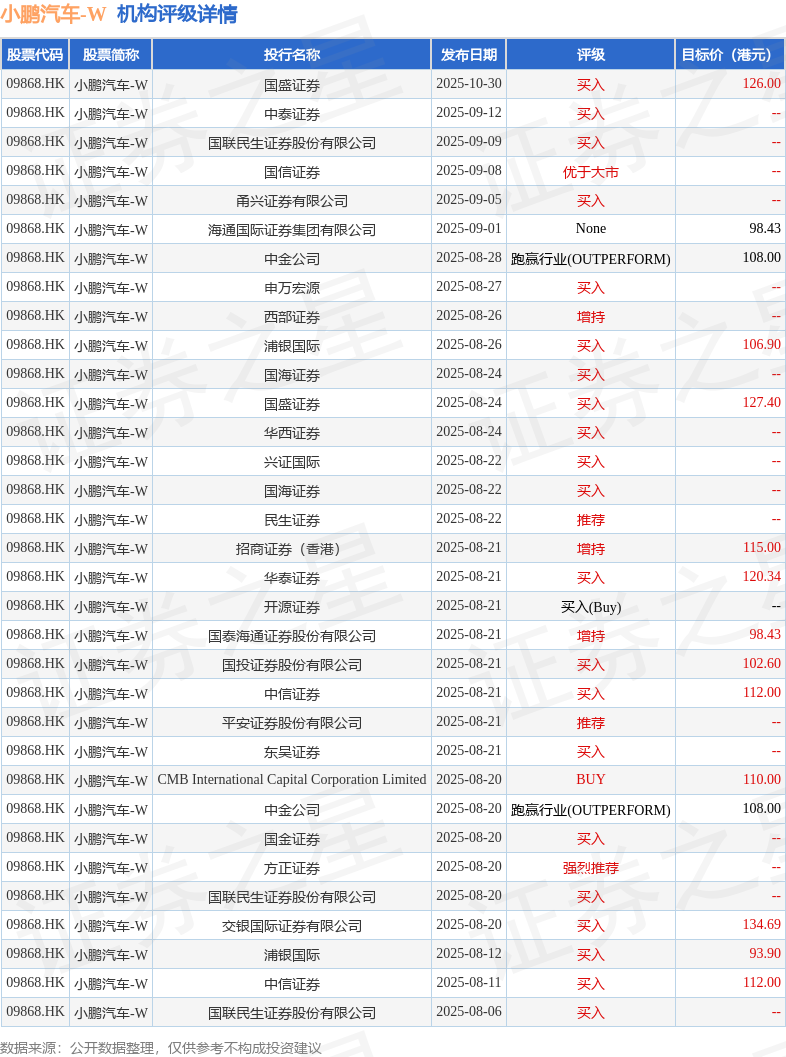 投行对该股的评级以买入为主,近90天内共有21家投行给出买入评级,近90天的目标均价为111.58港元。国盛证券最新一份研报给予小鹏汽车-W买入评级,目标价126港元。