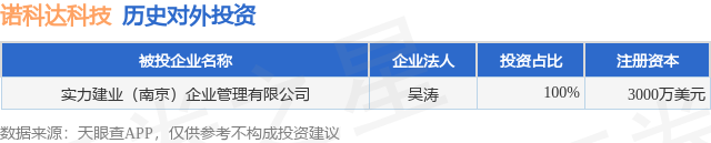 证券之星消息,根据天眼查APP显示,诺科达科技(00519.HK)新增一起对外投资事件,被投资公司为实力建业(南京)企业管理有限公司,法定代表人吴涛,投资占比为100%。该公司从事商务服务业,注册资本为3000万美元。目前,诺科达科技共存在对外投资1项,详见下表: