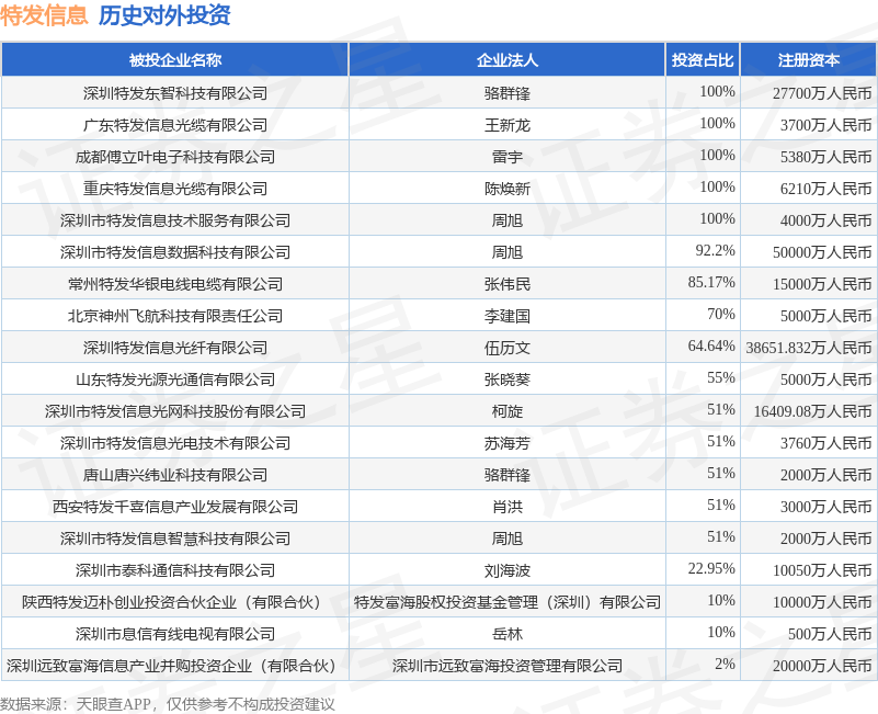 证券之星消息,根据天眼查APP显示,特发信息(000070.SZ)新增一起对外投资事件,被投资公司为唐山唐兴纬业科技有限公司,法定代表人骆群锋,投资占比为51%。该公司从事科技推广和应用服务业,注册资本为2000万人民币。目前,特发信息共存在对外投资19项,详见下表: