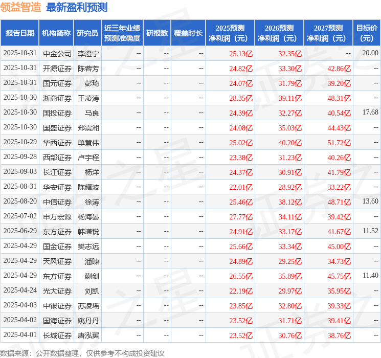 最新盈利预测明细如下: