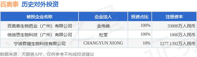 证券之星消息,根据天眼查APP显示,百奥泰(688177.SH)新增一起对外投资事件,被投资公司为百奥泰生物药业(广州)有限公司,法定代表人金伟峰,投资占比为100%。该公司从事医药制造业,注册资本为33000万人民币。目前,百奥泰共存在对外投资3项,详见下表: