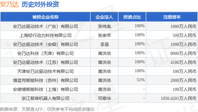 证券之星消息,根据天眼查APP显示,安乃达(603350.SH)新增一起对外投资事件,被投资公司为博蓝克智能科技(苏州)有限公司,法定代表人黄洪岳,投资占比为51%。该公司从事计算机、通信和其他电子设备制造业,注册资本为2000万人民币。目前,安乃达共存在对外投资9项,详见下表: