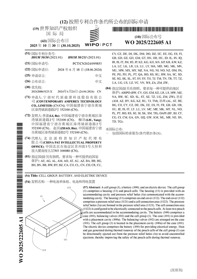 证券之星消息,根据企查查数据显示宁德时代(300750)公布了一项国际专利申请,专利名为“一种电池单体组、电池和用电装置”,专利申请号为PCT/CN2024/099853,国际公布日为2025年10月30日。