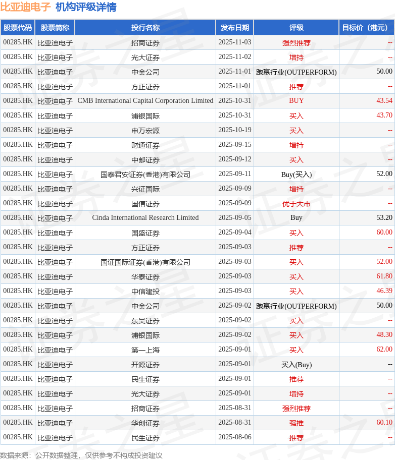 投行对该股的评级以买入为主,近90天内共有10家投行给出买入评级,近90天的目标均价为52.54港元。招商证券最新一份研报给予比亚迪电子强烈推荐评级。