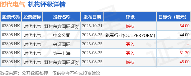 投行对该股的评级以增持为主,近90天内共有2家投行给出增持评级,近90天的目标均价为48.58港元。野村东方国际证券最新一份研报给予时代电气增持评级,目标价54港元。