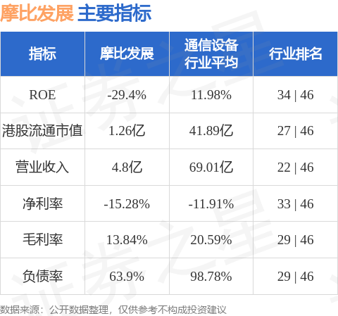 摩比发展港股市值1.26亿港元,在通信设备行业中排名第27。主要指标见下表: