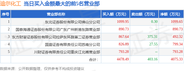 截至2025年11月3日收盘,迪尔化工(920304)报收于16.06元,上涨20.75%,换手率32.92%,成交量25.95万手,成交额4.08亿元。