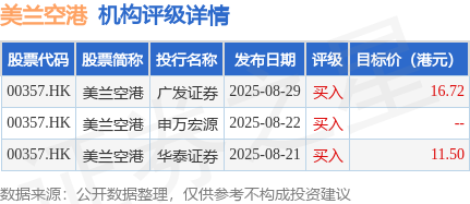 截至2025年11月3日收盘,美兰空港(00357.HK)报收于10.58港元,上涨0.76%,成交量107.03万股,成交额1126.56万港元。投行对该股的评级以买入为主,近90天内共有3家投行给出买入评级,近90天的目标均价为14.11港元。广发证券最新一份研报给予美兰空港买入评级,目标价16.72港元。