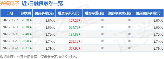兴福电子融资融券信息显示,融资方面,当日融资买入1639.01万元,融资偿还1511.78万元,融资净买入127.23万元。融券方面,融券卖出0.0股,融券偿还0.0股,融券余量0.0股,融券余额0.0万元。融资融券余额2.67亿元。