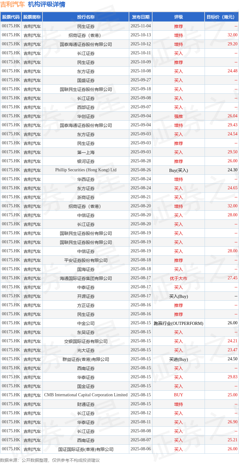 投行对该股的评级以买入为主,近90天内共有28家投行给出买入评级,近90天的目标均价为26.81港元。民生证券最新一份研报给予吉利汽车推荐评级。