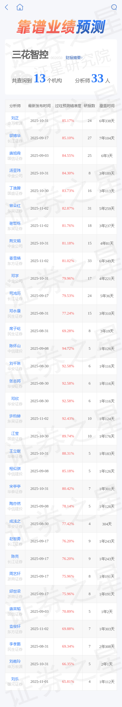 如果您对这家公司感兴趣,可以参考证星研究院统计的三花智控的分析师业绩预测数据,其中根据申万宏源的分析师刘正预测公司未来PE为43.0(更多特色估值数据尽在证星研究院,所有数据均来源公开资料,期且所有资料都存在一定时间滞后,所有相关数据均不可作为投资决策单一依据)。