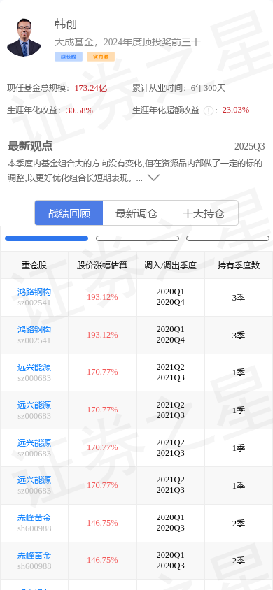 中金黄金(600489)是基金大佬韩创的重仓股。,其在整个职业生涯内年化收益高达30.58%。韩创管理的大成睿景灵活配置混合A基金在2024年1季度调入中金黄金,已连续持有1年又3个季度,持有期间的估算收益率达到61.48%。(以上数据经过后复权近似计算)韩创的大佬持仓 - 战绩回顾截图如下: