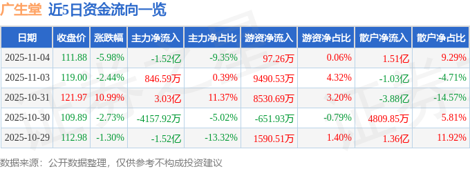 证券之星消息,截至2025年11月4日收盘,广生堂(300436)报收于111.88元,下跌5.98%,换手率10.38%,成交量14.19万手,成交额16.25亿元。